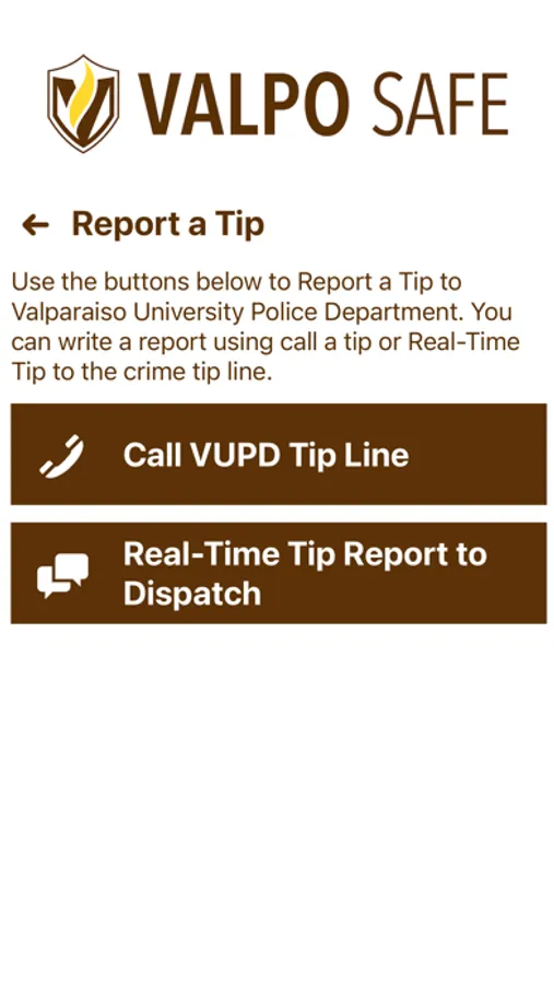 - Tip Reporting: Multiple ways to report a safety/security concern directly to Valparaiso University security.