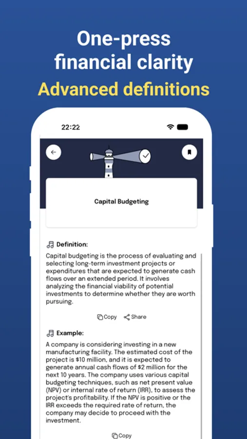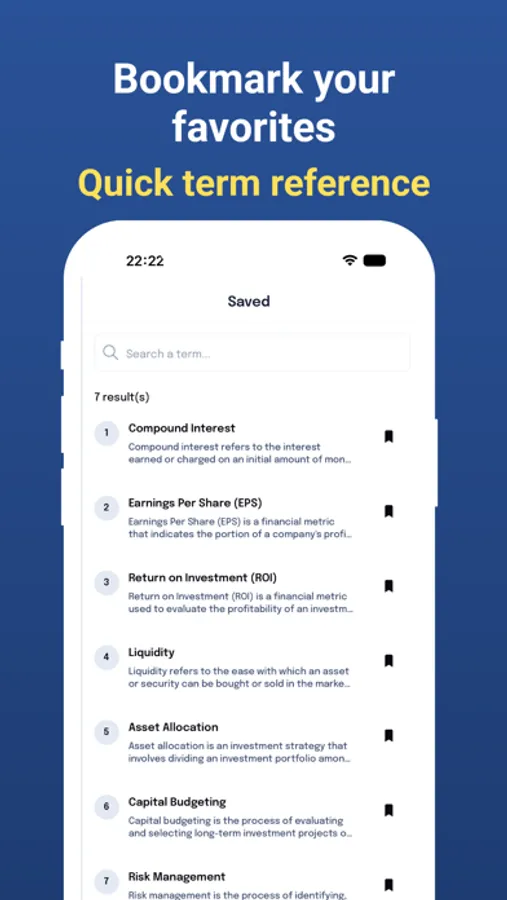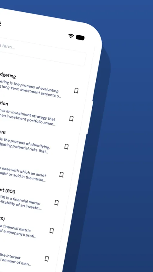 Search and Bookmark: Effortlessly search for specific terms or concepts and bookmark your favorites for future reference. Offline Access: No internet connection? No problem! Download the entire dictionary for offline access, ensuring you have valuable financial information even when you're on the go.