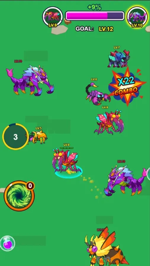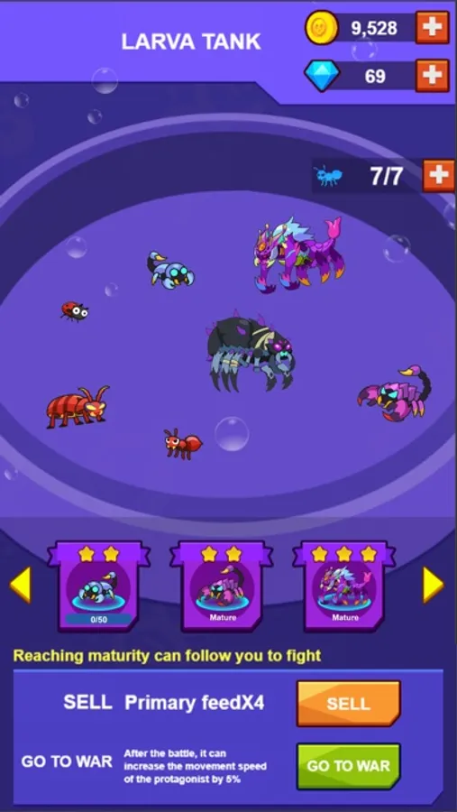 In this game, you will begin with an ant which is at the lowest level. You should constantly devour other insects, which are at your level or lower level than you, to evolve into an insect with high level.