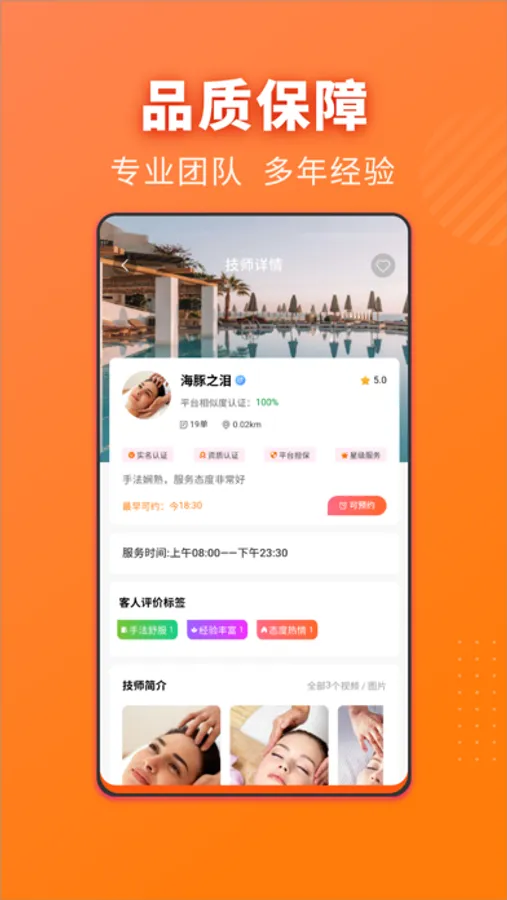 应用具有真实的技师资历认证机制,可以为用户提供专业资深的技师服务。用户可以在应用查看技师详细信息,包括技师资历、服务项目、客户评价、服务报价等,以便选择适合的技师。