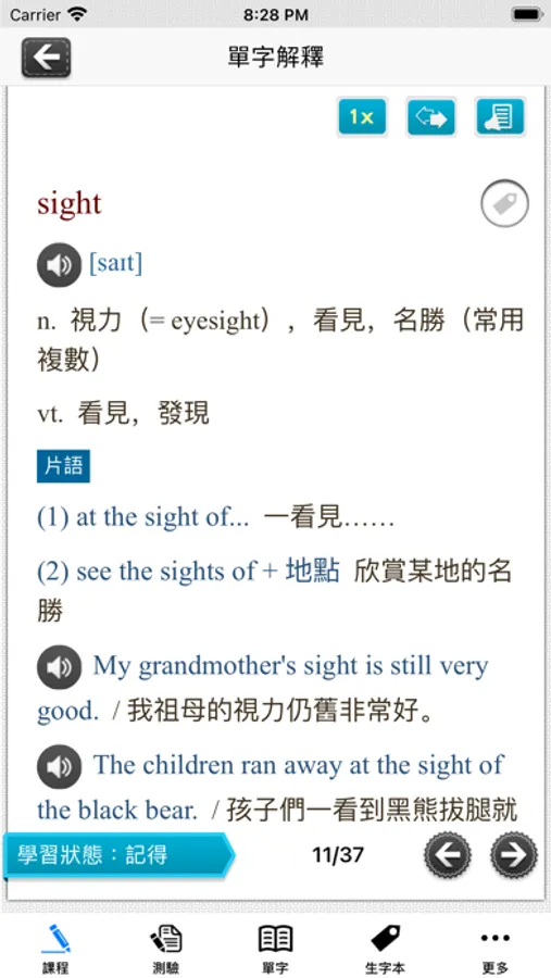 * 每個單字、片語和例句等都有專業美籍播音員真人發音。