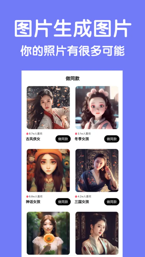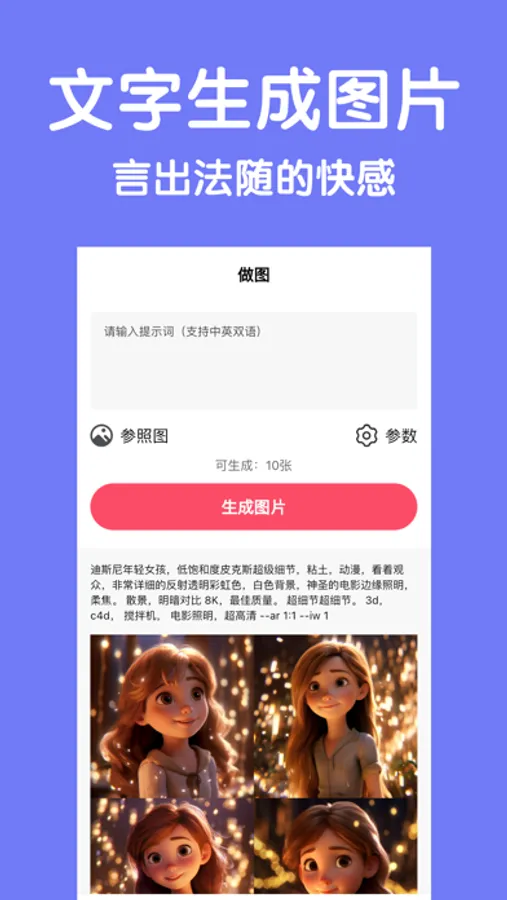 这是一款帮助你ai生成头像照片的工具,您可以通过输入文字提示词,参考图,模板等方式,创作出你自己的图片。