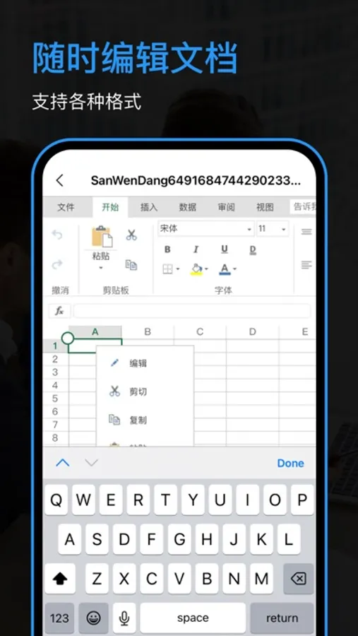 手机办公是一款可以在手机上文档表格幻灯片编辑软件,你可以新建文档也可以从其他应用导入编辑,手机办公还提供实用的可编辑模版,助力你的职场发展!