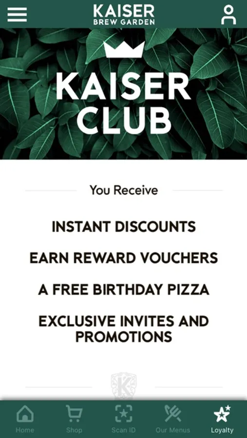 Welcome to Kaiser Club Rewards! Kaiser Club Rewards is Kaiser Brew Garden’s loyalty program where you get instant discounts and earn $20 reward vouchers to spend on anything you like at any time. There are also stamp cards on Coffee’s and Brew Cannon’s, plus its free to join and you get a free pizza for your birthday. Download the Kaiser Club Rewards app today and you will receive a welcome gift of our signature Agria Fries (worth $15) when you register.
