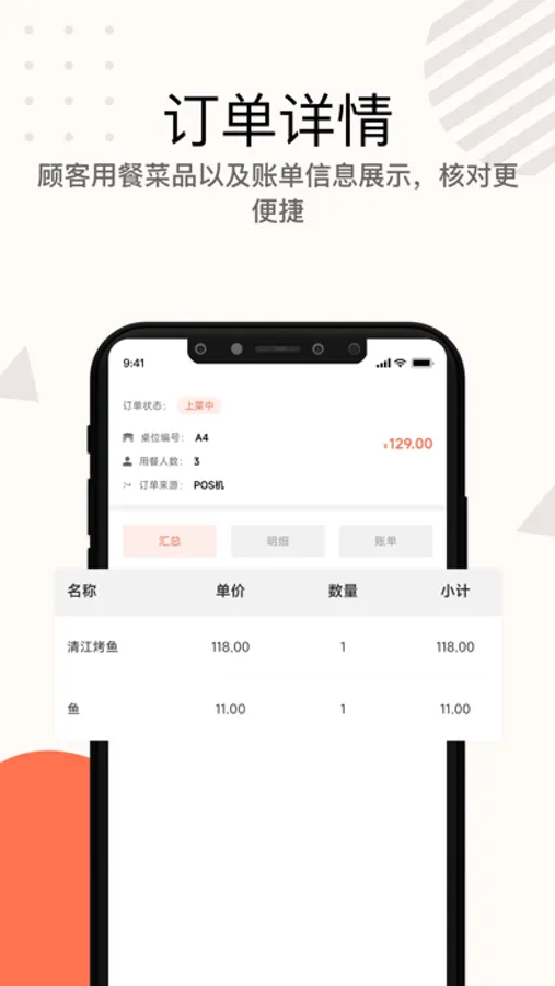 顾客用餐菜品以及账单信息展示,核对更便捷