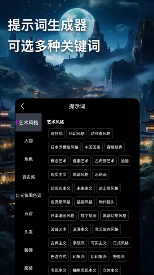 *指令咒语生成器:特别为各位艺术家打造了AI指令咒语生成器,包含各式各样的人物、环境、动作、五官、服装、风格等,轻松构造你的梦中角色,快速创作艺术作品。
