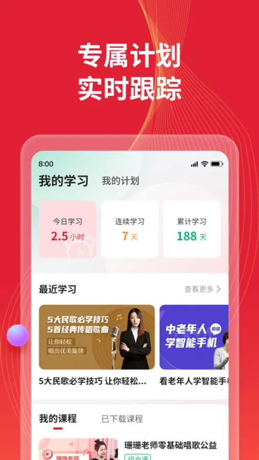 【专属的学习计划】 根据用户的学习内容制定个性化的学习计划,每日根据计划完善自身学习需求,还有课程学习提醒,不错过每一节精彩课程。