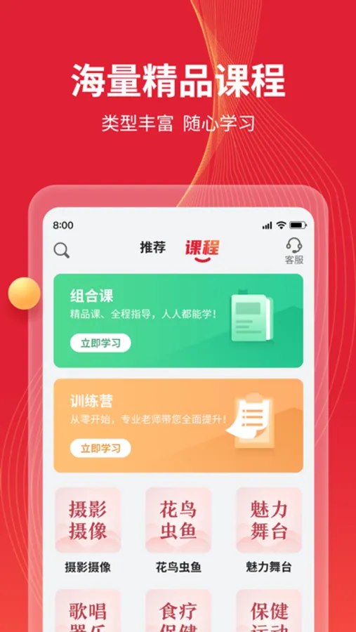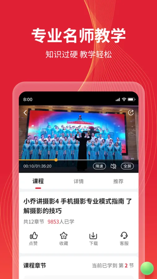 【海量的兴趣课程】 包含摄影摄像、歌唱、舞蹈、书法、国画、运动、养生、乐器、形体、朗诵等众多兴趣课程,用户可根据自己的需求选择学习相应的课程;