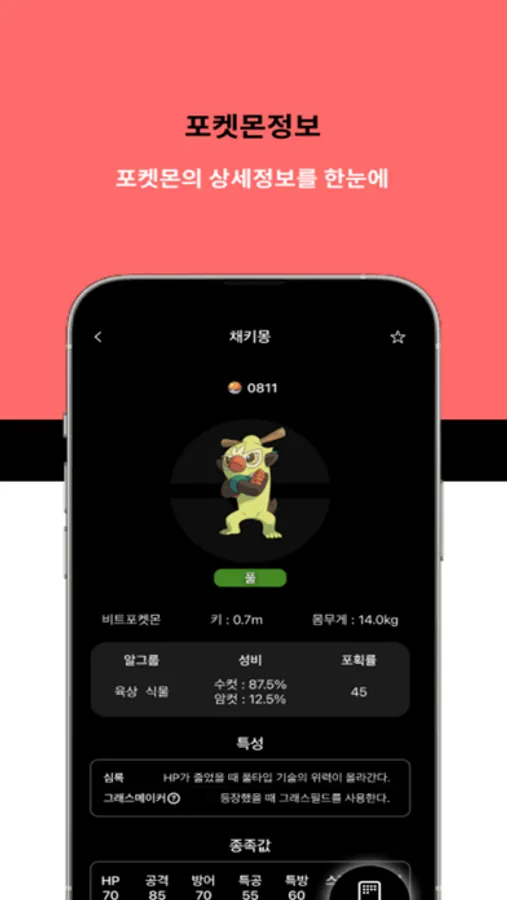 - 포켓몬의 분류/키/몸무게/알그룹/성비/포획률/특성/종족값/진화트리/도감설명 등 상세정보를 제공합니다.