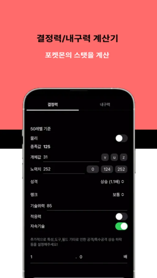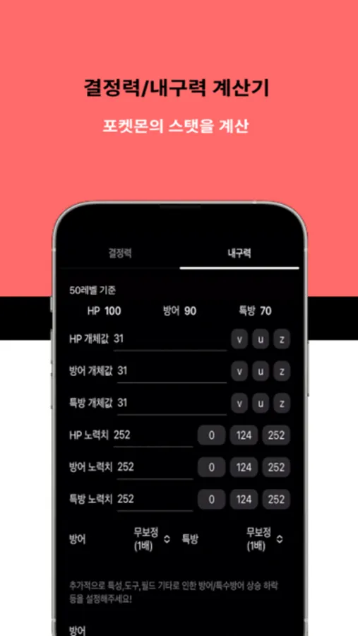 - 실전배틀을 위한 결정력/내구력 계산기능을 제공합니다.