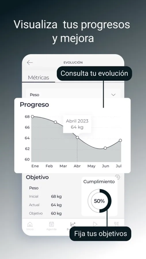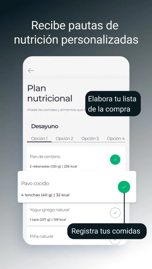 Recibe tus planes personalizados de nutrición, entrenamiento y actividad física a través de mi app. Podrás acceder a: