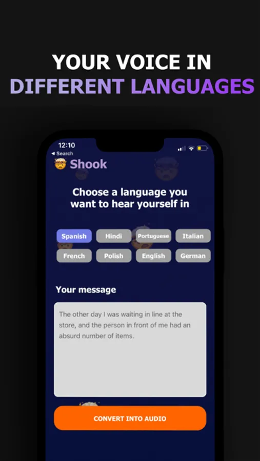 Shook is a new app that lets you clone your voice, hear yourself in different languages, and send voice messages to your friends. We use cutting-edge AI to make the messages sound just like you, but in different languages.