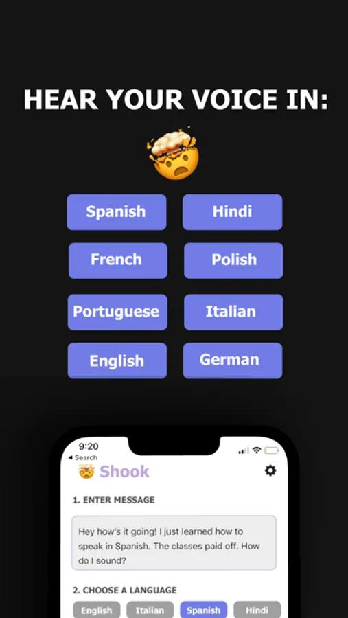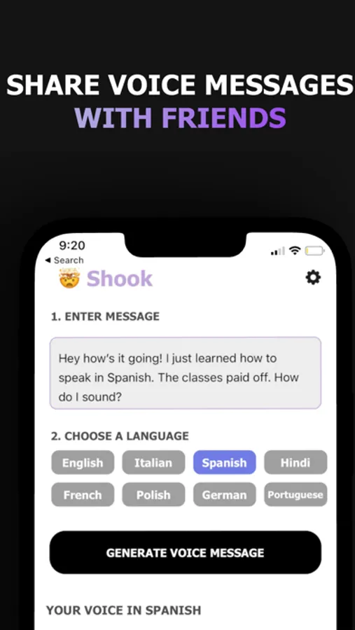 When you type a message in English, Shook will translate it to your selected language instantly, in your own voice, and allow you to share with friends.