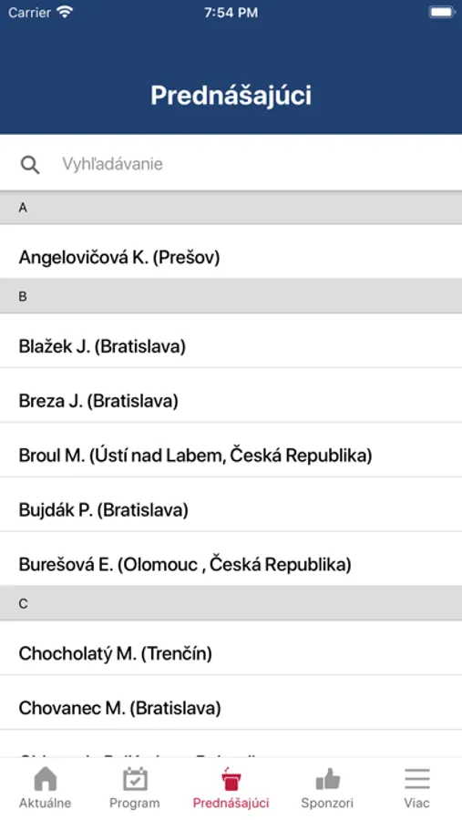 Aplikácia obsahuje aj zoznam prednášajúcich v ktorom je možné vyhľadávať, zoznam sponzorov ako aj zoznam abstraktov ktoré na kongrese odznejú.