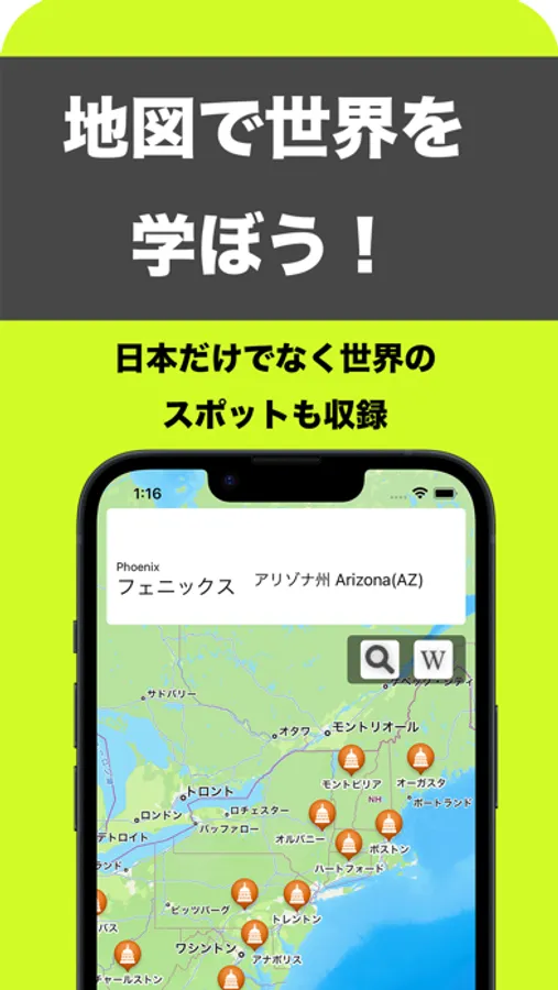 地図で学ぼうマップでクイズ。地図を動かしながらその場所に関連することがらを覚えることができます。
