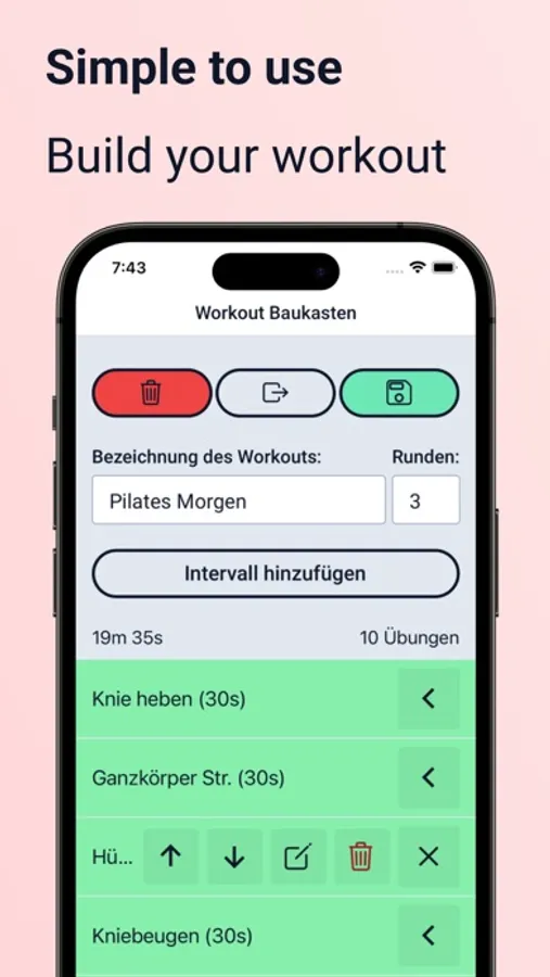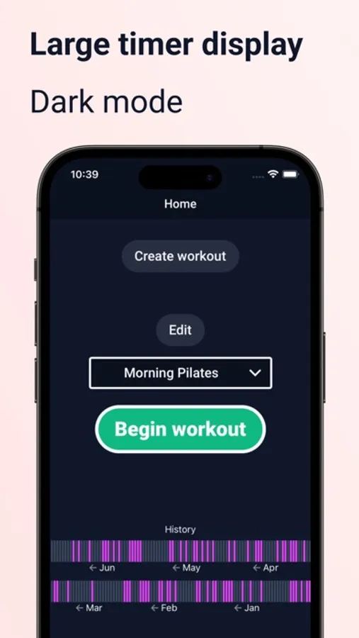 Easily create, edit, and delete timed intervals for your workouts. Timers countdown each exercise, rest and recovery period – and the full workout. Sound and/or vibrate signal the end of each interval. There is a large display which can be read at a distance. You can see a visual history of your recent workout history. Both English and German languages are available. The app can be displayed in light or dark mode, and has a choice of sounds.
