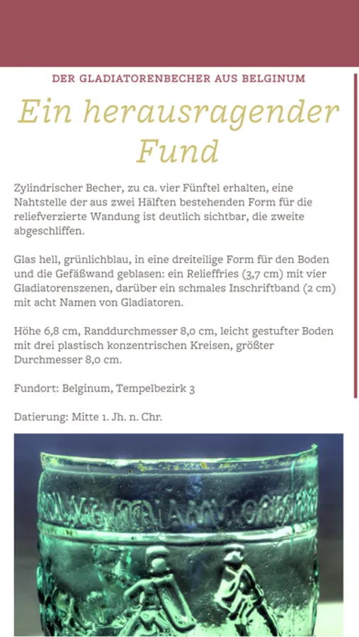 BelginumAR ist eine Ausstellungs- und Führungs-App für das Kulturzentrum Archäologiepark Belginum. Erleben Sie weiterführende Texte und Grafiken zu ausgewählten Objekten, 3D-Rekonstruktionen archäologischer Objekte und ein 3D-Modell von Belginum von keltischer Zeit und römischer Zeit bis ins Mittelalter.
