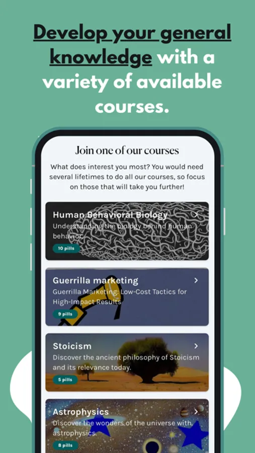 Hundreds of microcourses about history, science, art, psicology, philosophy, and many other disciplines, all in a mobile app, so you can become more cultured by playing.