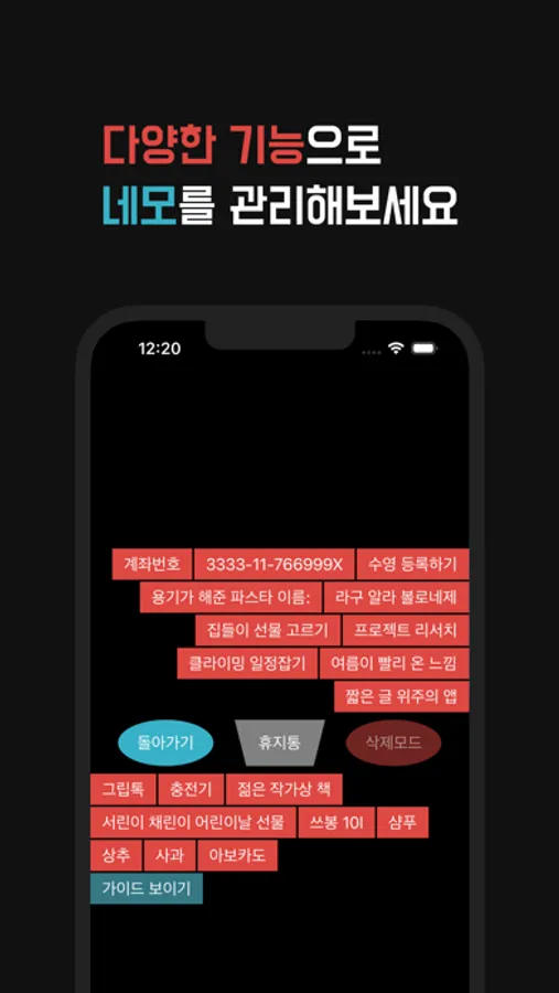 네모는 짧은 글 위주의 메모 앱이에요. 꼭 필요한 기능만 담아 편하고 가벼워요.