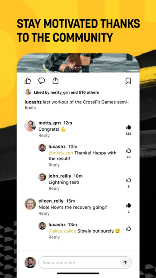- Follow your friends to send and receive encouragement by liking or commenting on the workouts of the day.