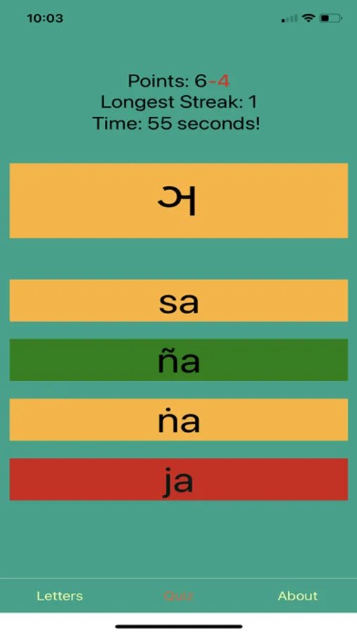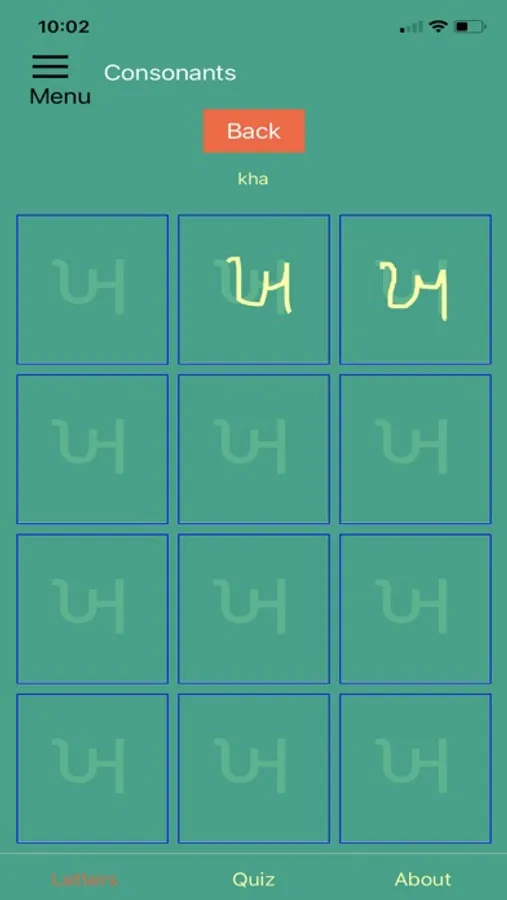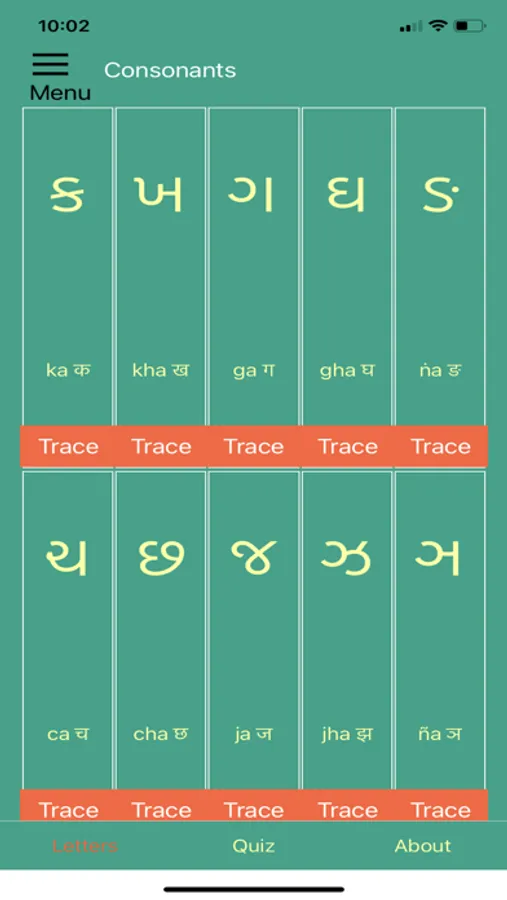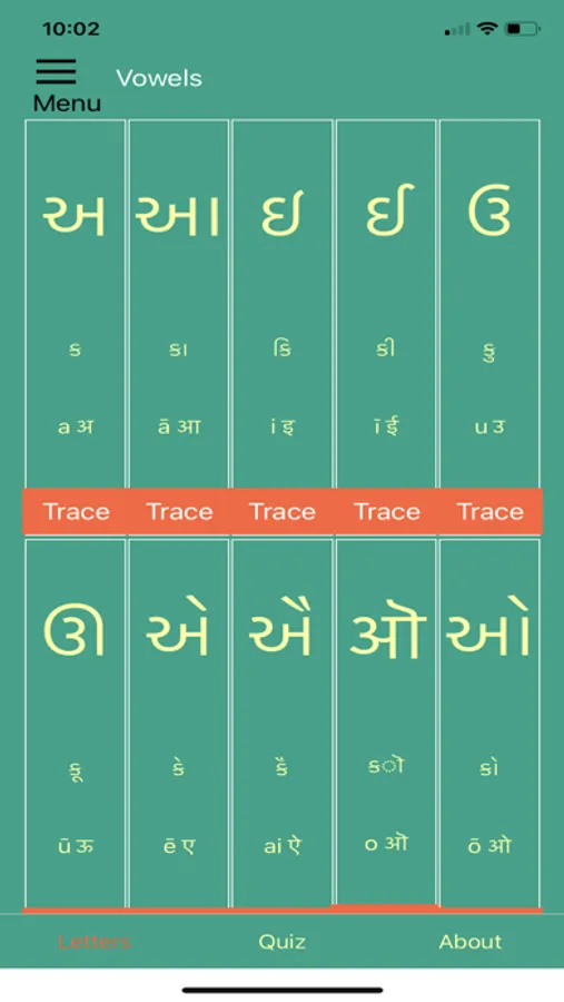 This app can help you learn the Gujarati alphabet! Practice tracing each one until you're familiar-- then quiz yourself on the letters!