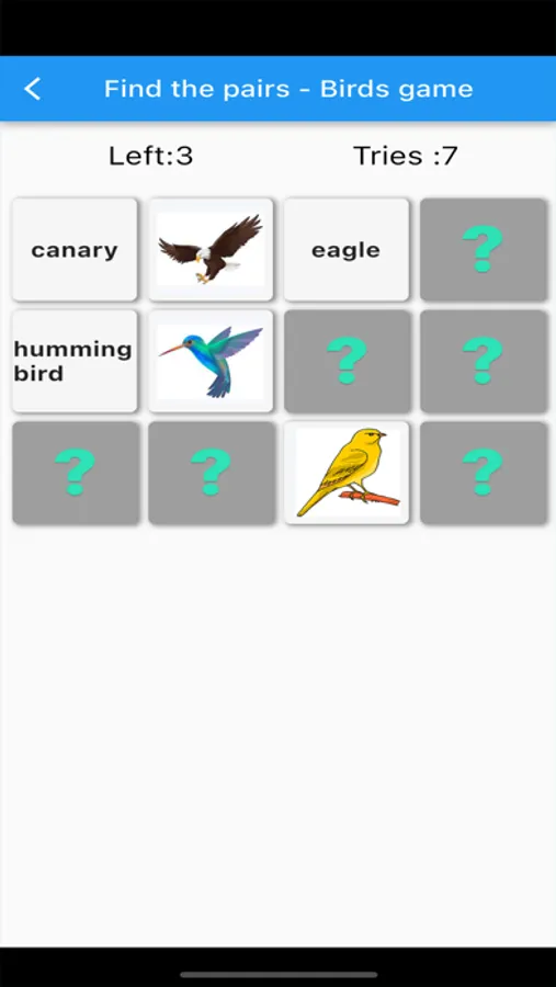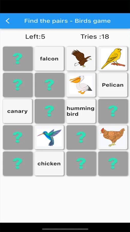 Learning English birds vocabulary by play memory game - Find the pairs. You can play any where without internet connection