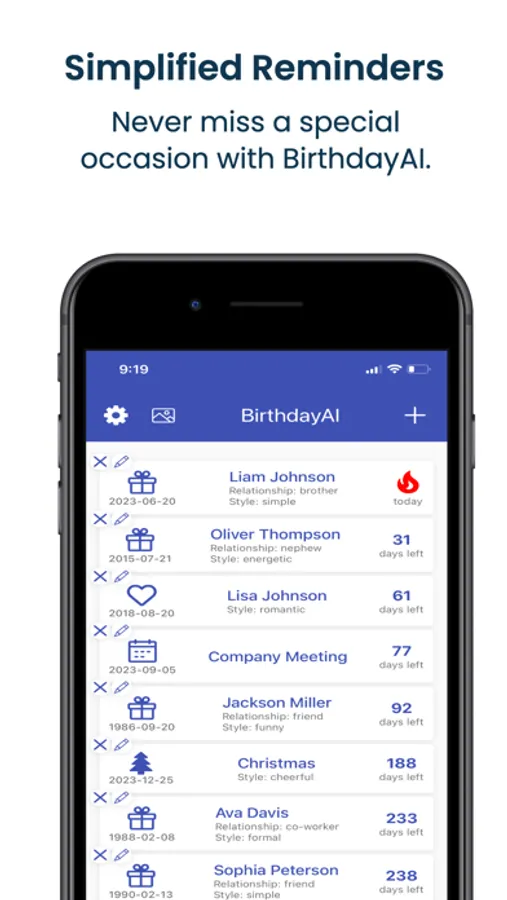 Introducing BirthdayAI – your smart reminder app for birthdays, anniversaries, holidays, and more! With our cutting-edge technology, you'll never forget another important day or struggle to find the right words to celebrate it.