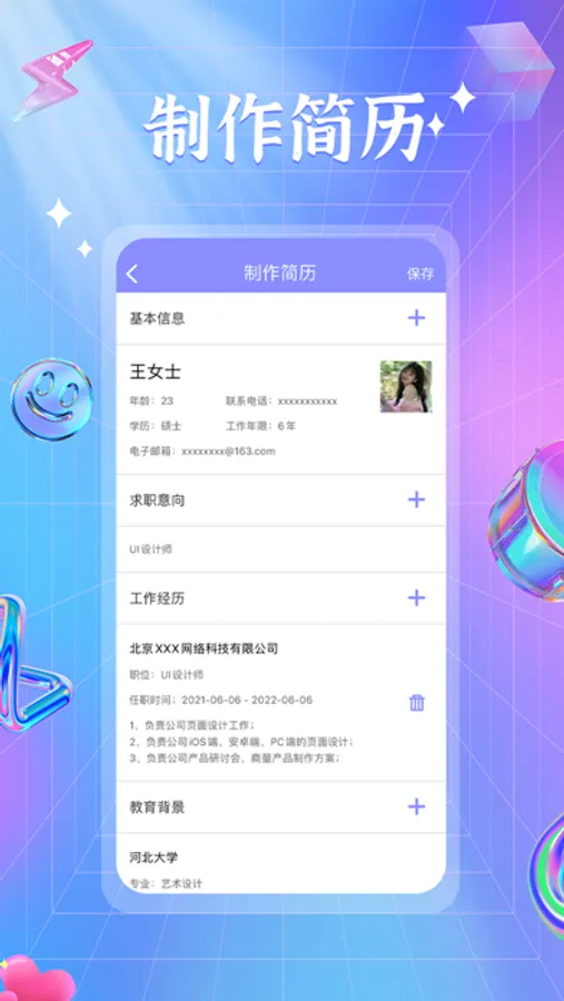 "简历-专业简历制作软件"是一款专为求职者设计的移动应用程序,旨在帮助用户创建、编辑和管理个人简历。该应用提供了一个简单而功能强大的平台,使用户能够以专业和吸引人的方式展示自己的技能、经验和教育背景。