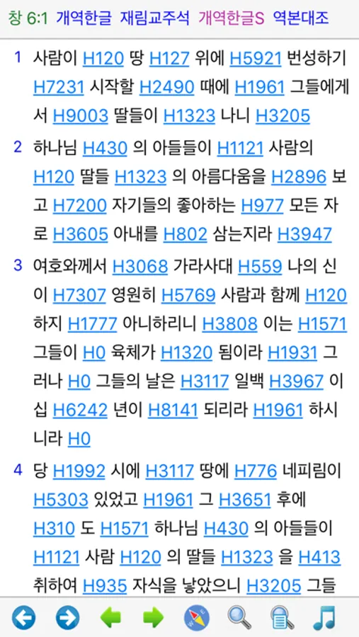 10. 원전분해 및 원어코드 역본에 병기된 스트롱코드를 누르면 원어사전을 보여줍니다. 원어사전 화면에서도 스트롱코드를 원어코드 역본에서 검색할 수 있습니다.