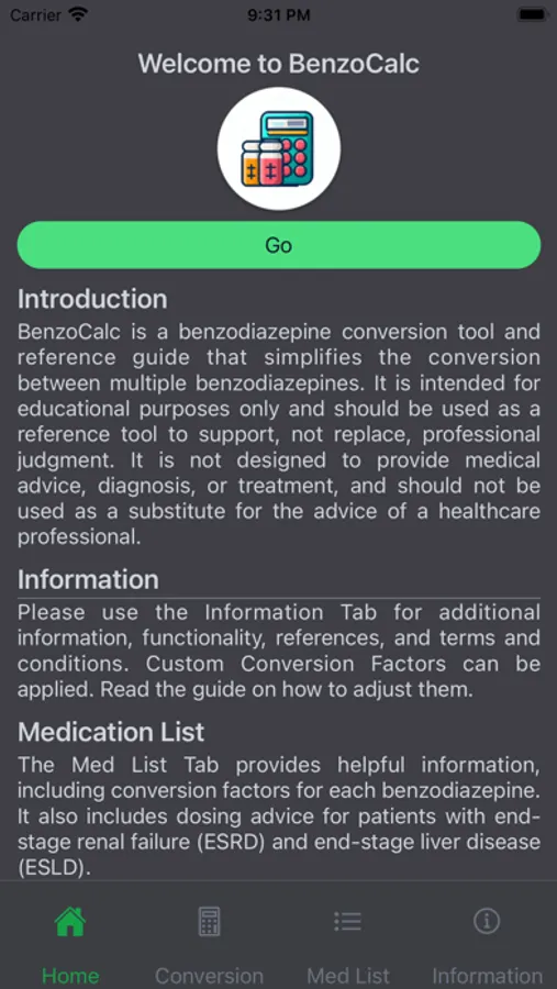 *The BenzoCalc app is intended for educational purposes only and should be used as a reference tool to support professional judgment. It is not designed to provide medical advice, diagnosis, or treatment. The information provided in the app is not a substitute for the advice of a healthcare professional. Users of the BenzoCalc app are encouraged to consult with a healthcare professional for personalized advice and guidance regarding their specific medical condition or situation.