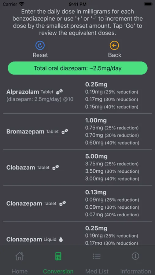 - Total oral diazepam calculation: The app calculates the total daily dose of oral diazepam based on the entered doses and conversion factors.