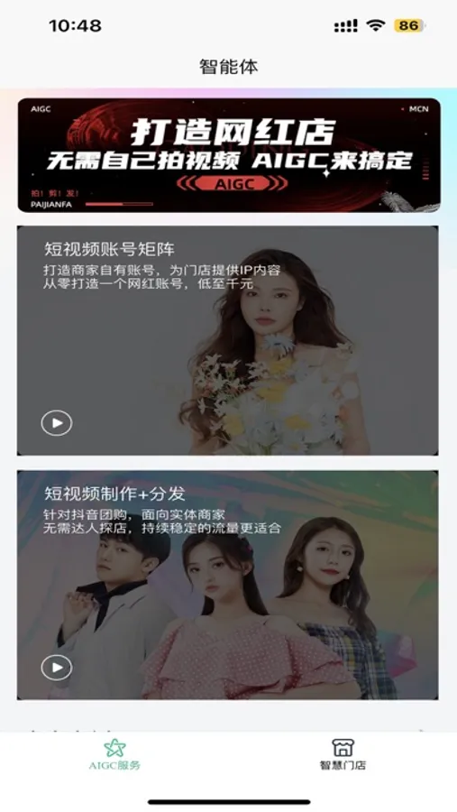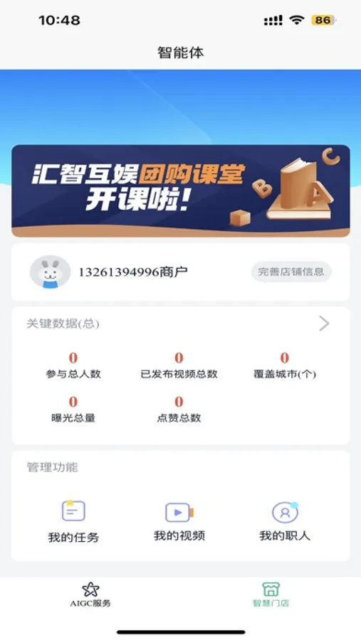 智能体是一款专注为商户提供视频营销赋能的应用。在这里,你可以随时查看我们的智能服务,在接下来的后续更新中,我们将会持续更新发布任务、商品购买等服务