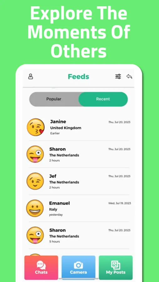 Your photo or video will appear on the PicToss feed, explore which posts are currently popular and react tot hem! Receive likes on your own posts or give people a like to tell them you love their view! It is even possible to filter people in your area or age-range!