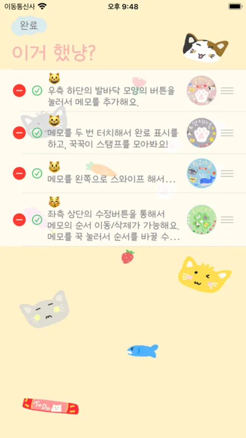 2. 메모를 두 번 탭 해서 완료 표시를 하고, 다시 두 번 탭 하면 취소할 수 있어요.