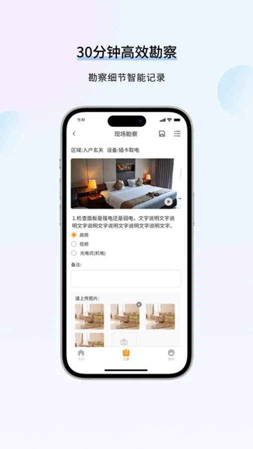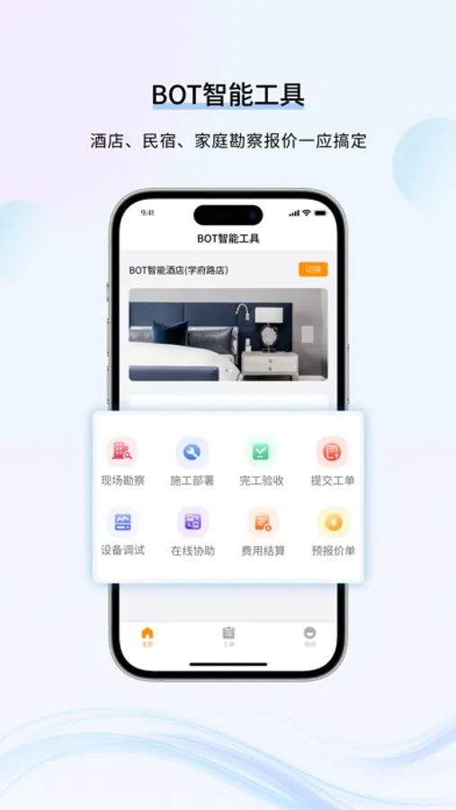BOT 智能工具具备现场勘察记录、设备连接调试、工程工单管理等模块,将工程勘察复杂的过程简化为数据流以便进行高效的后台管理,为勘察业务提供更为高效与标准化的流程。