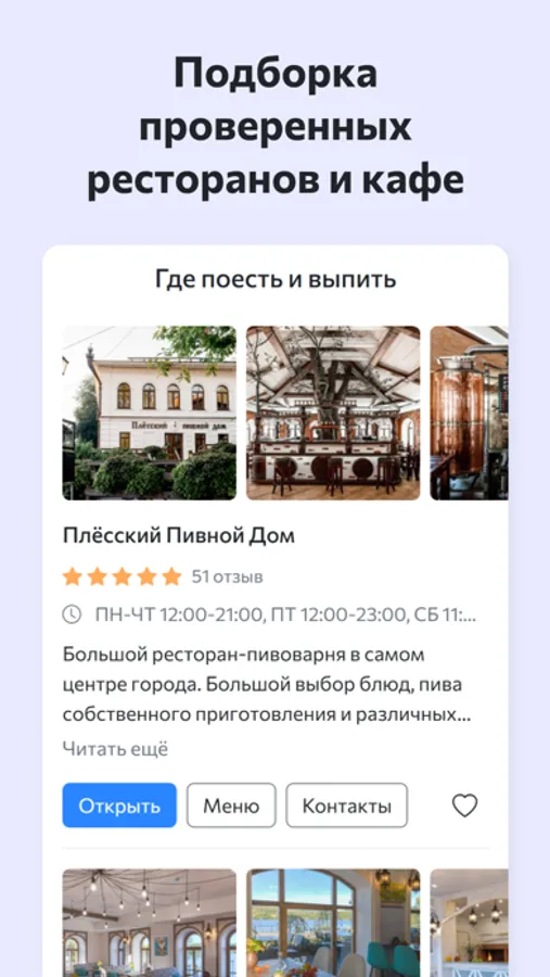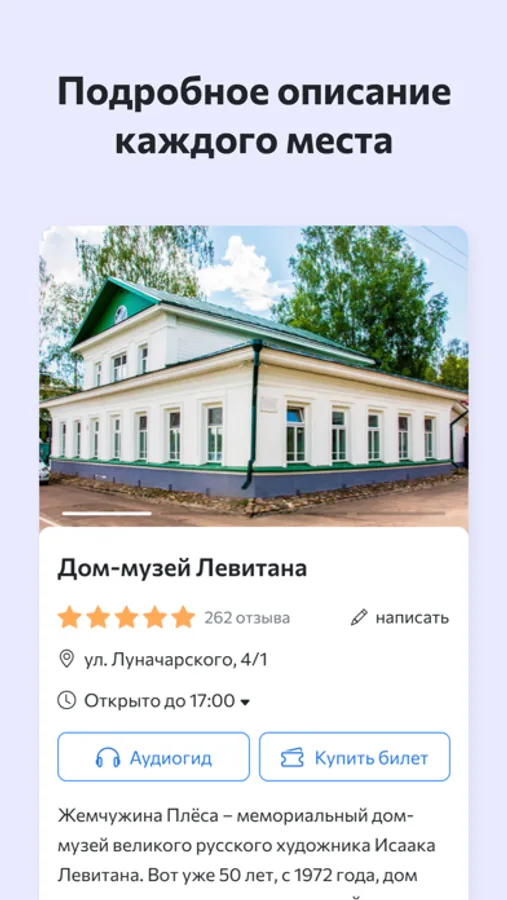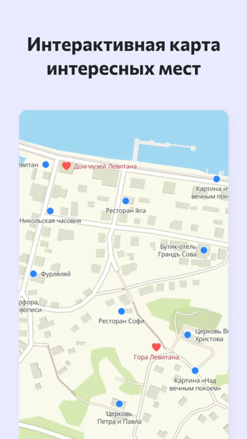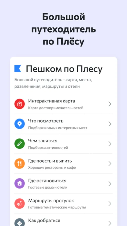 Мобильное приложение «Пешком по Плёсу» от Kinkol - это интерактивная карта, достопримечательности, отели, развлечения, маршруты, аудиогид по Плёсу разработанный местными жителями.