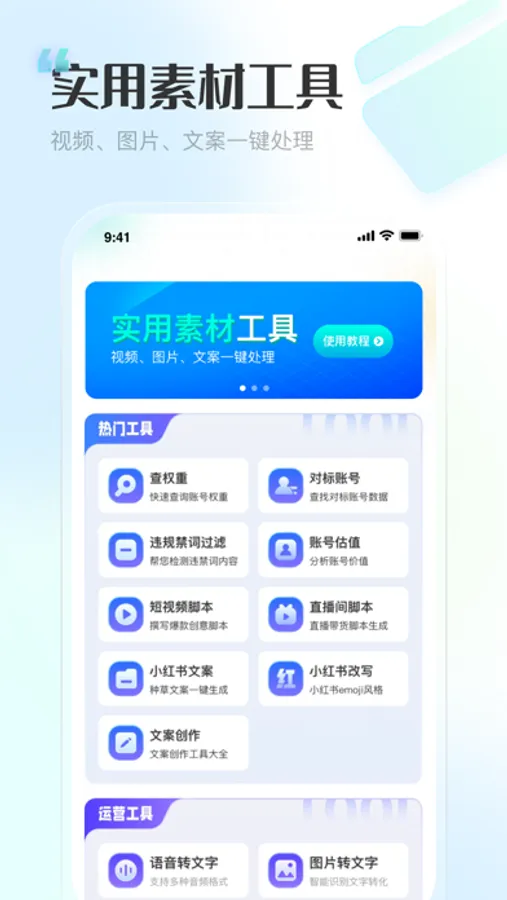 我们提供视频文案提取、账号诊断、账号估价、视频镜像、一键修改MD5值、图片转文字、语音转文字、长图拼接以及抖音权重查询等多种创作工具助你一臂之力。