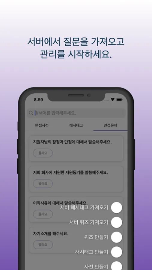 Interview Preps allows you to easily add and manage a variety of interview questions provided by the server, enabling you to efficiently prepare for your interviews.