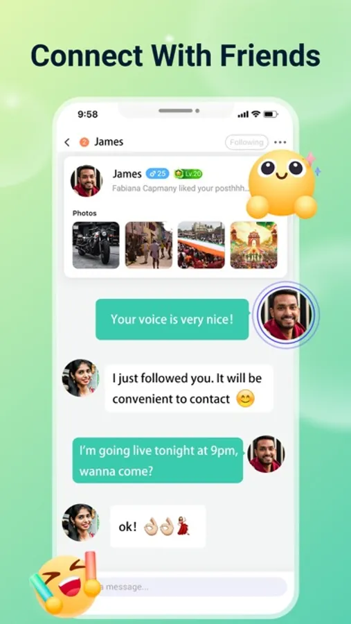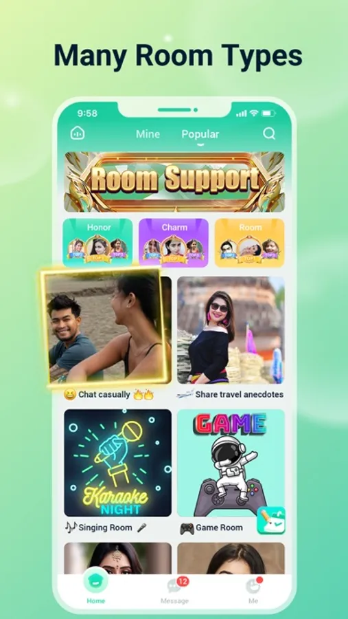 On Hapi, you can join various live rooms, chat instantly with friends from around the world, and easily connect with People with the same interests as you