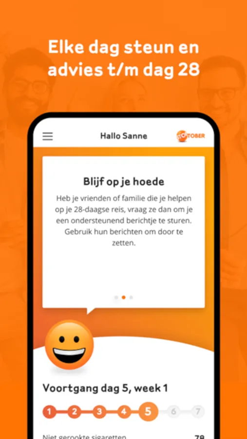 De app wordt elke 24 uur automatisch bijgewerkt met een nieuwe motiverende boodschap om je te supporten tijdens de eerste 28 dagen na het stoppen. Aan het einde van de 28 dagen kun je zelf de keuze maken om de app nog langer te gebruiken of niet.