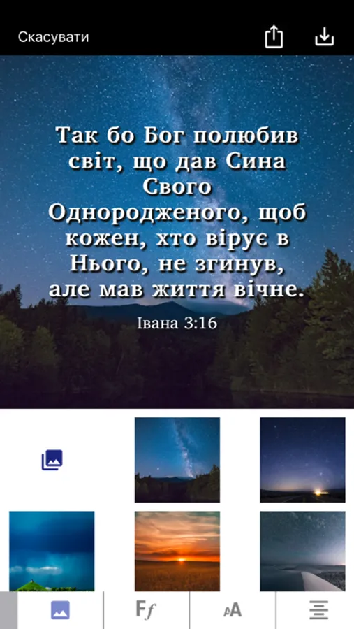 • When you tap on a verse, an image button is shown on the bottom toolbar. When this button is pressed, the 'Edit image' screen appears. You can choose the background image, move the text around the image, change the font, text size, alignment, format and color. The finished image can be saved to the device and shared with others.