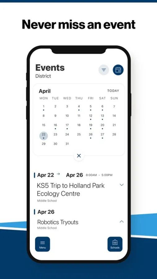 The event section shows a list of events throughout the district. Users can add an event to their calendar to share the event with friends and family with one tap.