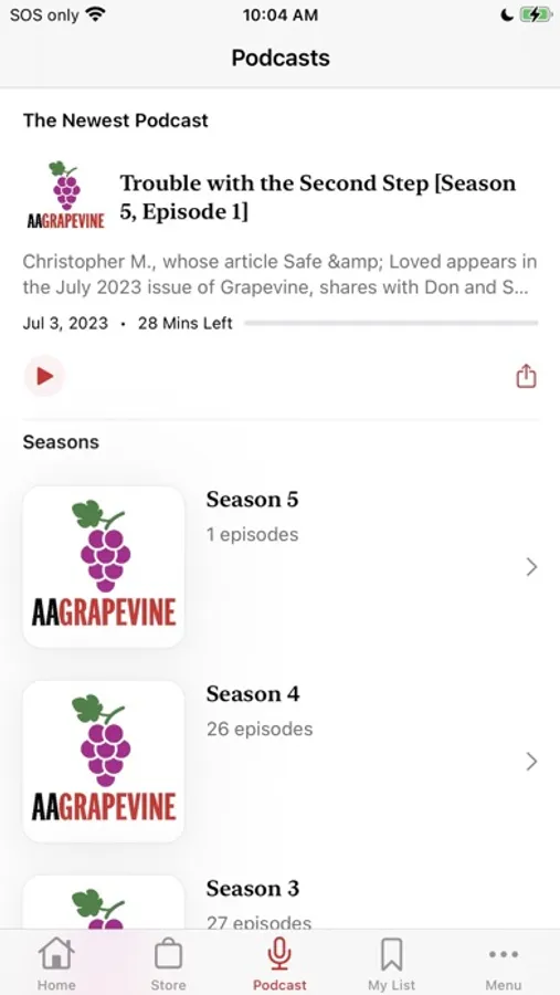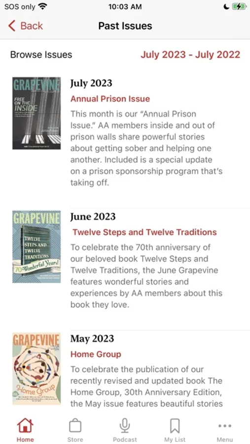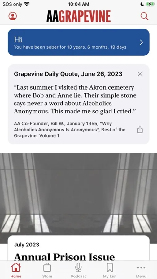 The Grapevine app is all things Grapevine right on your smartphone. The monthly magazine, the articles archives, the podcast, the daily quote, an enhanced sobriety calculator, and the AA events calendar. App-exclusive features include a spiritual maintenance checklist and the ability to share articles, and your own experience, strength, and hope with other Grapevine app users. The app allows for more content each month too. Service-oriented members will find easy ways to be a part of the AA Grapevine Community in our Get Involved section. You’ll be able to read Grapevine anonymously wherever you go. You can also listen to each month’s articles on a playlist, and listen to the podcast playlist right on the app.