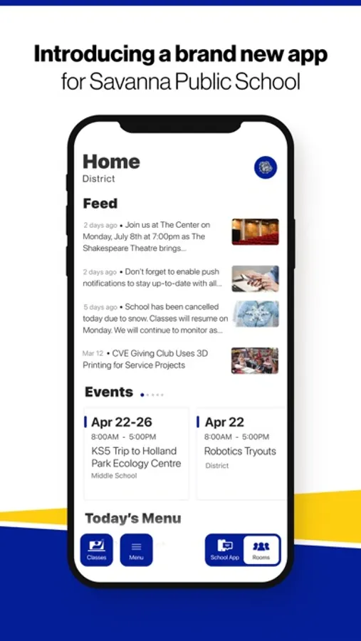 The event section shows a list of events throughout the district. Users can add an event to their calendar to share the event with friends and family with one tap.