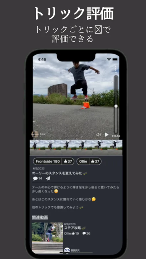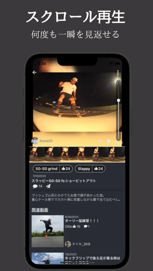 投稿した動画をスクロールに合わせて動かすことができるので、トリックの瞬間を見逃すことなく何度も見返すことができます。