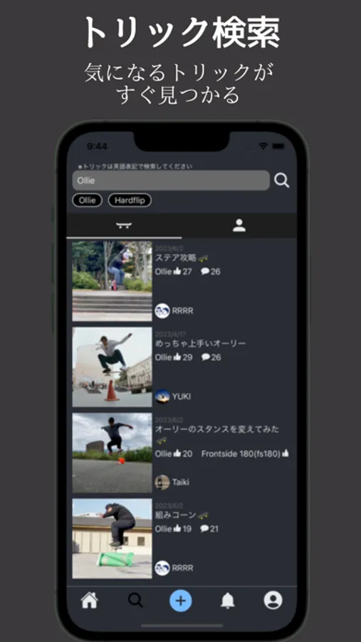 気になったスケーターの投稿もスクロールに合わせてトリックを見ることができるので、トリックの瞬間にどのような動きをしているのか参考にして、