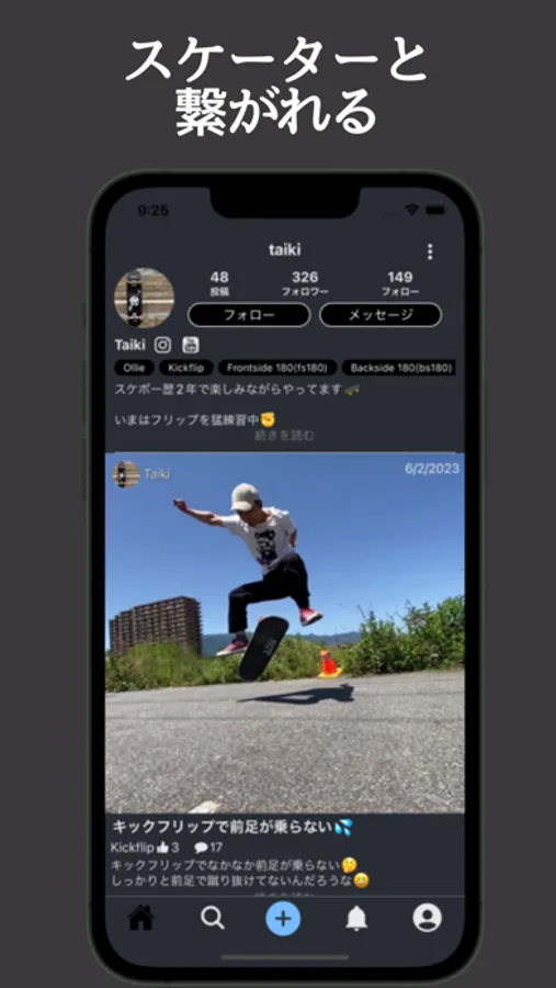 スケーターとフォロー・コメント・メッセージなどで気軽に繋がることができるので、パーク感覚で楽しみながら成長し、あなたのスケートスタイルを共有することができます。