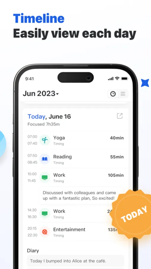 1) Diary: You can record your daily thoughts or musings. Combined with the timeline, you'll gain insight into how you spend each day, leading to a certain therapeutic effect.