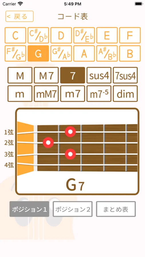 またウクレレでの基本的なローポジションの押さえ方に加えて、もうひとつハイポジション側のコードを載せ、