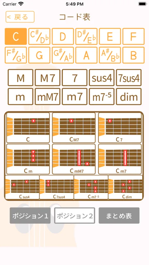 各コードに対して2種類ずつの押さえ方を掲載。